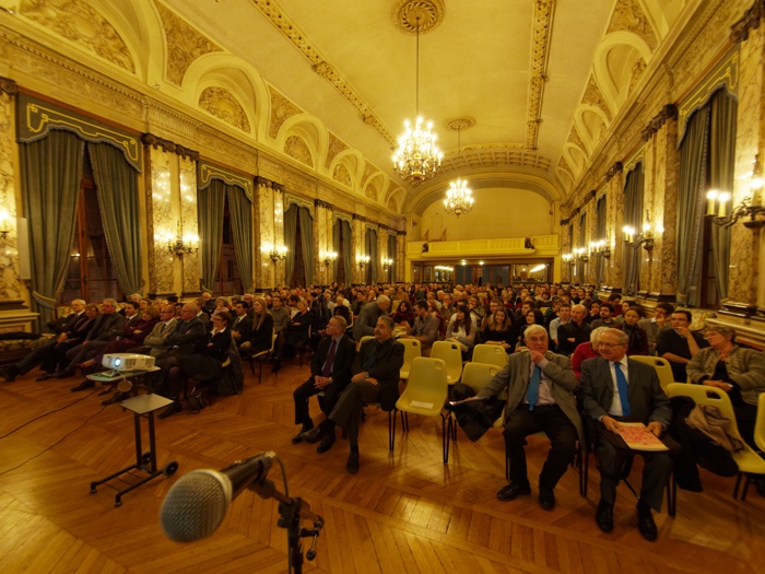 C'est une foule nombreuse (plus de 250 personnes) qui s'est réunie pour écouter l'intervention de M. Jacob avant une longue séance de questions-réponses qui fut l'occasion d'un échange avec le public présent dont tous les élèves de CPGE et un grand nombre de leurs professeurs, mais aussi de nombreuses autres personnes qui avaient été sensibles à la thématique retenue. Comme pour Albert Fert, Christian Jacob s'est ensuite vu remettre un Magnum de Champagne gravé à l'effigie de notre association en souvenir de la soirée.