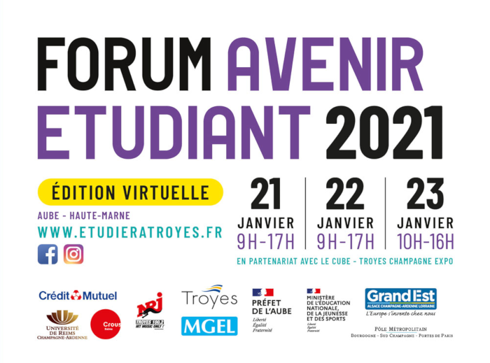 Dans le cadre contraint des mesures sanitaires liées à la COVID-19, le Forum Avenir Étudiant 2021 (Édition Aube-Haute-Marne) ne se tiendra pas comme lors des dernières éditions au Parc des Expos de Troyes mais dans un inédit format virtuel. Vous pouvez d'ores et déjà retenir dans vos agendas les dates des 21, 22 et 23 janvier 2021 de 9h à 17h afin de nous rencontrer : les lycéens auront ainsi des créneaux répartis par établissement sur les journées de jeudi et vendredi afin de nous rencontrer par ordinateur ou smartphone interposé. Plus d'informations sur les modalités pratiques très prochainement.