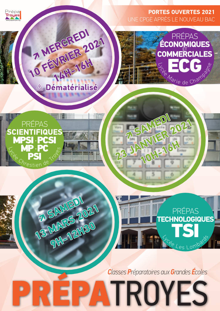 Nous serons présents sur ce salon sur un stand PrépaTroyes pour y présenter à la fois les CPGE économiques et commerciales du lycée Marie de Champagne et les CPGE scientifiques du lycée Chrestien de Troyes.