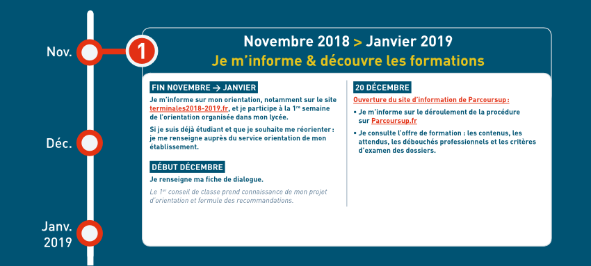 A l'approche de la fin de l'année 2019 et des premières échéances concernant l'orientation post-bac avec l'ouverture le 20 décembre de la plate-forme Parcoursup pour y consulter les formations du supérieur accessibles en 2020, nous avons souhaité faire un point récapitulatif des différents événements d'orientation que nous organisons ou auxquels nous participons et qui seront autant de possibilités de nous rencontrer. Vous retrouverez ci-contre l'essentiel des dates à retenir pour ce mois de décembre et le mois de janvier 2020.
