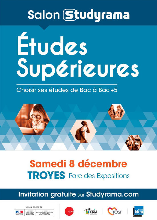 Se déroulera ce samedi 9 décembre de 10h à 17h le traditionnel Salon des Études supérieures organisé par Studyrama au hall 3 du Parc des Expos (Cube) à Troyes.