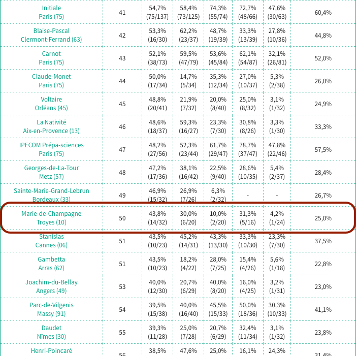 Le magazine l’Étudiant a publié récemment le classement 2016 des classes préparatoires économiques et commerciales. Ce classement confirme les très bons résultats des étudiants ayant choisi, après un bac ES, de poursuivre leur formation au sein de la classe préparatoire du lycée Marie de Champagne : 44% de la promotion 2015 a ainsi intégré ESCP, EM Lyon, EDHEC, Audencia, ESC Grenoble, Neoma, Toulouse Business School ou encore Kedge, ce qui place Marie de Champagne à la 50e place sur 97 établissements au niveau national pour l'année 2015 et confirme son statut de classe préparatoire de proximité qui permet de très belles réussites.